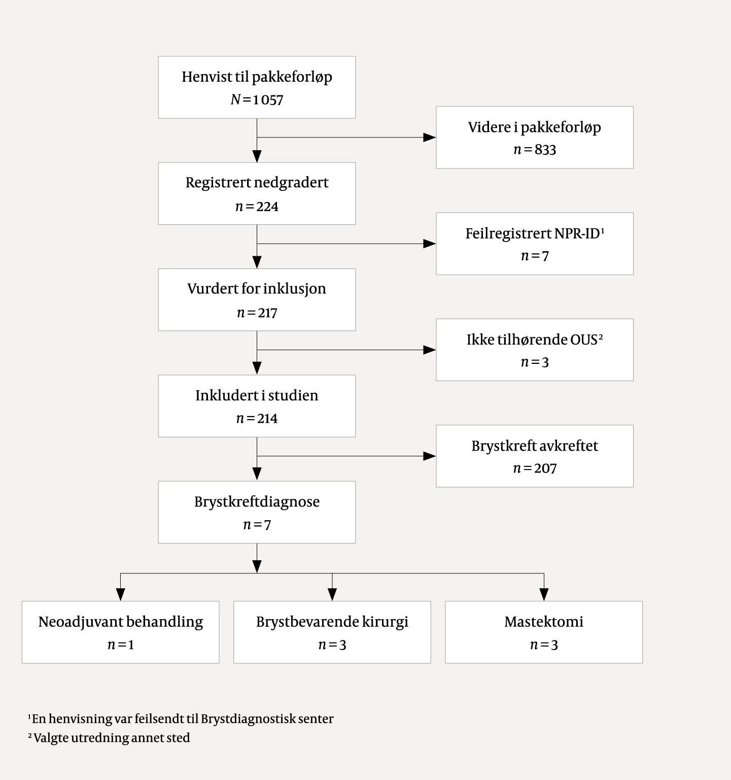 In 2020, the Breast Screening Centre received 5200 external referrals, of which 1057 were marked 'breast cancer patient pathway'. A total of 224 (21 %) of the referrals to the patient pathway were registered as downgraded. Seven of these were not assessed for inclusion (six had an incorrectly registered NPR ID number and one was mistakenly sent to breast diagnostics). Three patients who were not Oslo University Hospital patients and who chose to be examined by another institution were also excluded. The remaining 214 referrals were included in the study, as shown in Figure 1.