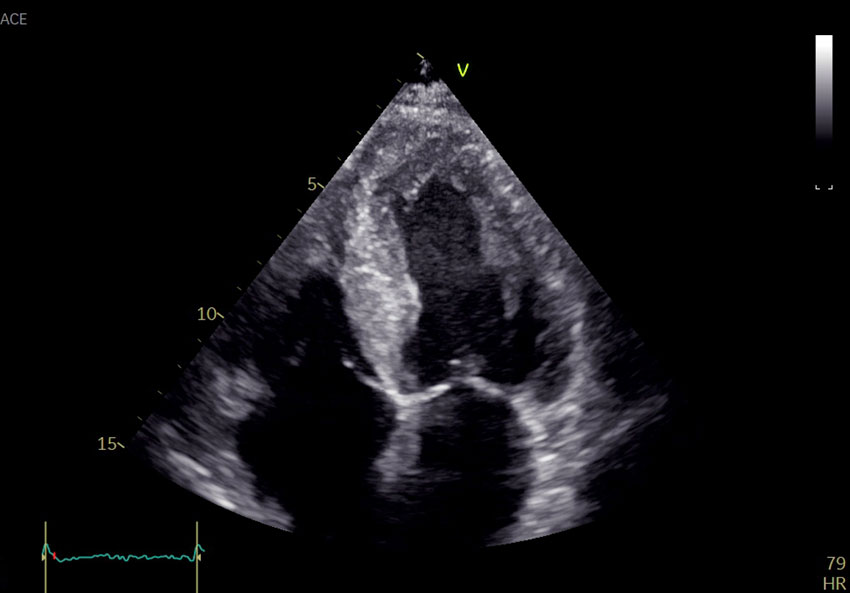 A man in his seventies was referred to a regional hospital for echocardiography and invasive coronary angiography as part of kidney transplant recipient workup. The patient had stage 5 chronic kidney disease and was receiving peritoneal dialysis. He did not have diabetes or hypertension. He had had stable monoclonal gammopathy of undetermined significance (MGUS) for 20 years. A renal biopsy taken ten years previously had revealed nephrosclerosis, but no deposition disease. Two years prior to the current admission, the patient had a cerebral stroke with sequelae in the form of dysarthria. Echocardiography at that time revealed mild left ventricular hypertrophy and diastolic dysfunction. He was receiving anticoagulant treatment with apixaban for permanent atrial fibrillation. He became generally fatigued on physical activity, but did not develop functional dyspnoea or chest pain.