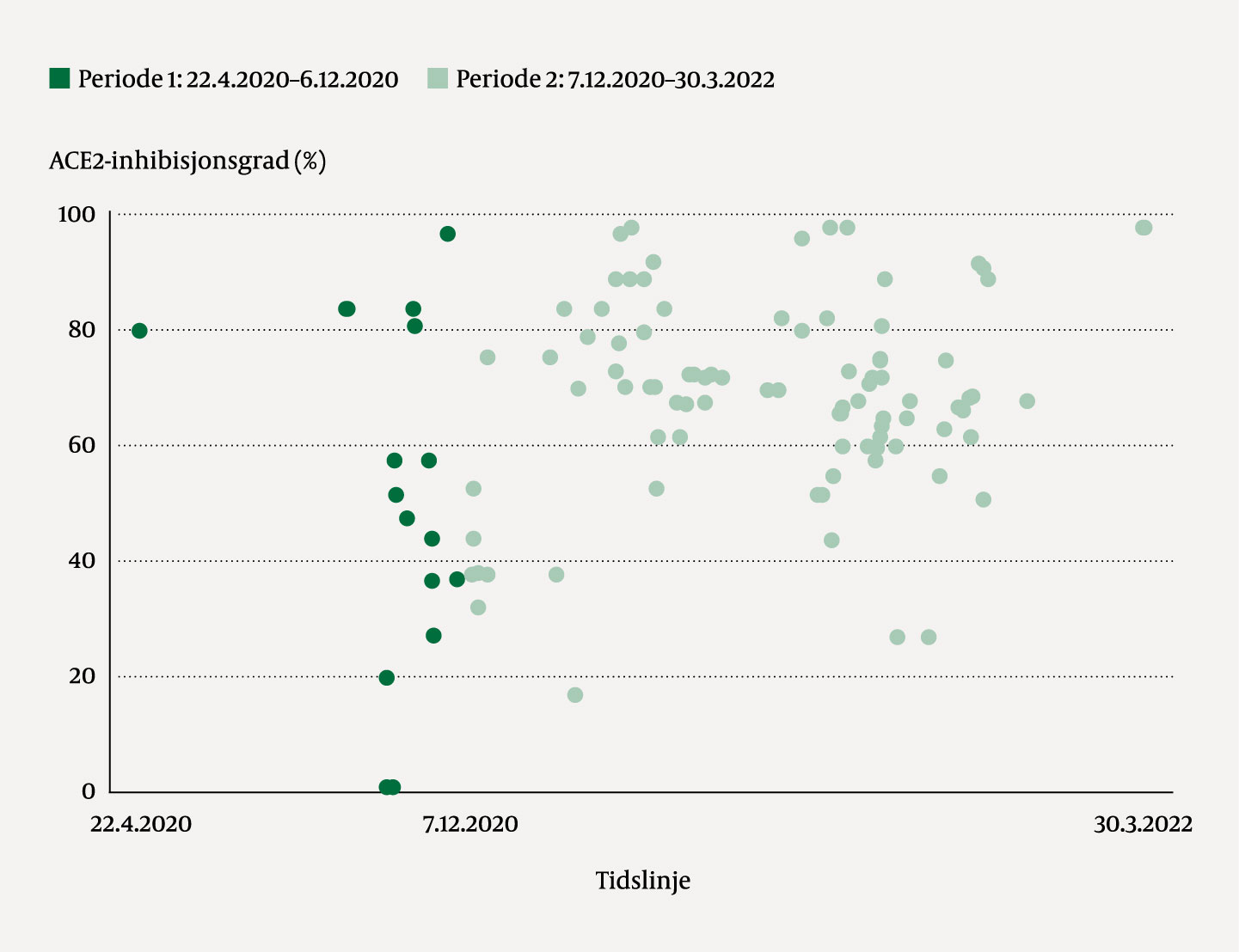 After separate consent for experimental treatment was obtained, 1–2 units of ABO-compatible COVID-19 convalescent plasma were ordered (1). Some patients received repeated treatments, and a total of 193 plasma units were transfused; 26 in period 1 (22 April 2020–6 December 2020) and 167 in period 2 (7 December 2020–30 March 2022). Antibody content, calculated as the angiotensin-converting enzyme 2 (ACE2) inhibition capacity (1, 3), was measured for 172/193 plasma units (Figure 1). In total, 46 transfused units had an ACE2 inhibition capacity of less than 60 %, either because they were administered early in the pandemic (3) or because they were rare blood types AB or B.