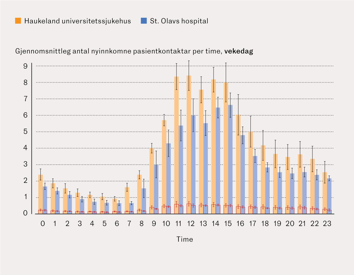 The ED at Haukeland University Hospital had a mean of 3.8 (SD 2.2) new patient visits per hour, and the corresponding figure at St Olav's Hospital was 2.5 (SD 1.6) (Figure 1). For new patient visits with the highest triage level, the mean per hour at Haukeland University Hospital was 0.4 (SD 0.2), compared to 0.3 (SD 0.1) at St Olav's Hospital.